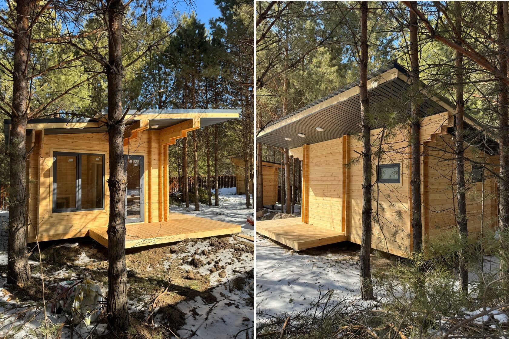 Представьте: основной дом из теплого золотистого бруса, где каждый срез дерева хранит историю горных склонов. Рядом — баня, будто младшая сестра, повторяющая его черты: те же плавные линии крыши, тот же ритм оконных проемов. Они переговариваются между собой языком архитектурных деталей — похожими карнизами, общим цветовым решением.