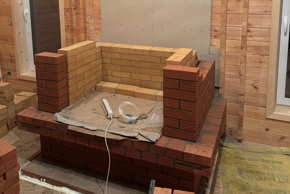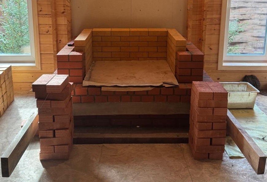Старт кладки портала: внутренний контур из шамота, наружная облицовка — лицевой кирпич; подготовлена предтопочная зона.